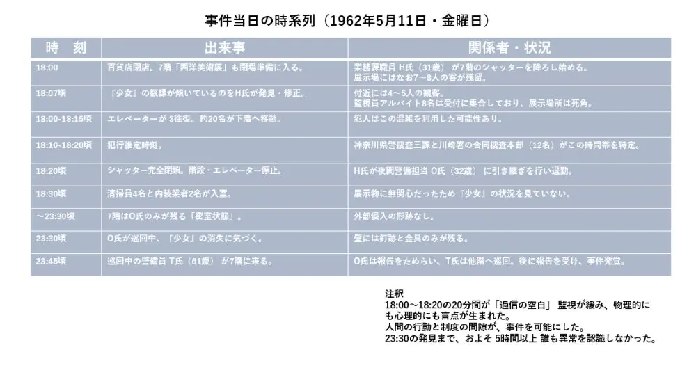 『少女』盗難は偶発的な窃盗でありながら、美術界の虚構を白日の下に晒した。この二つの事件は、牧歌的な昭和の「安全神話」の只中――百貨店という公共空間で起こった。