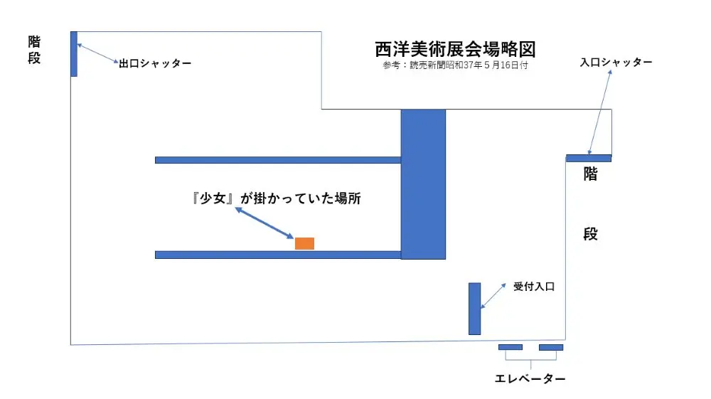 同店の閉店時刻は18時であり、当時、業務課職員H氏(31歳)が7階のシャッターを降ろしていた。展示場には女性1名を含む会社員や学生など7~8人が残っており、18時07分頃、H氏が『少女』の額縁が傾いているのを直した。