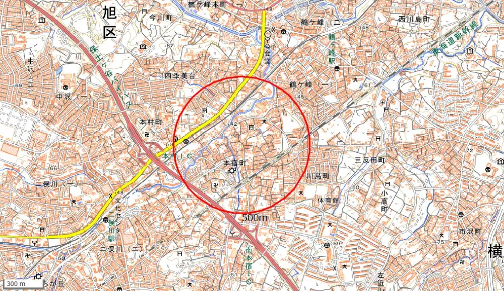 北に相鉄線(約200m)、南に東海道新幹線(約300m)。相鉄線と並走する厚木街道が東西に走り、西側には保土ヶ谷バイパス(国道16号・本村IC)が位置する。さらに半径約100m圏内には帷子川水系の支流が存在する。