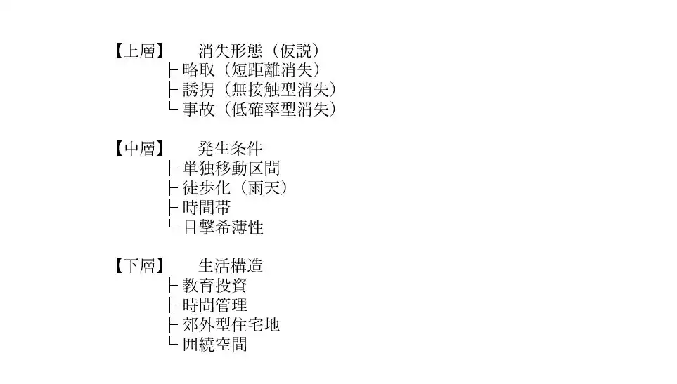略取仮説は短距離消失という条件を軸とし、誘拐仮説は無接触型消失の可能性を領域に含み、事故仮説は低確率型消失として整理された。