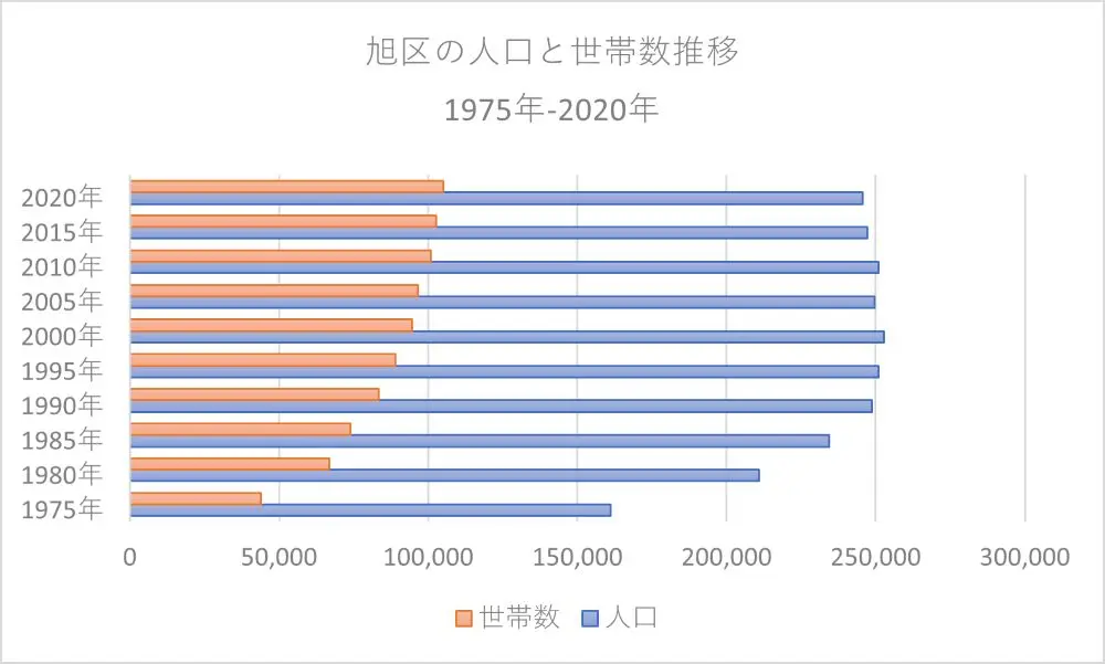 世帯数は同期間に約4万4千世帯から8万3千世帯へと拡大した。一方で、一世帯あたりの人員は3.6人から2.98人へと減少している。