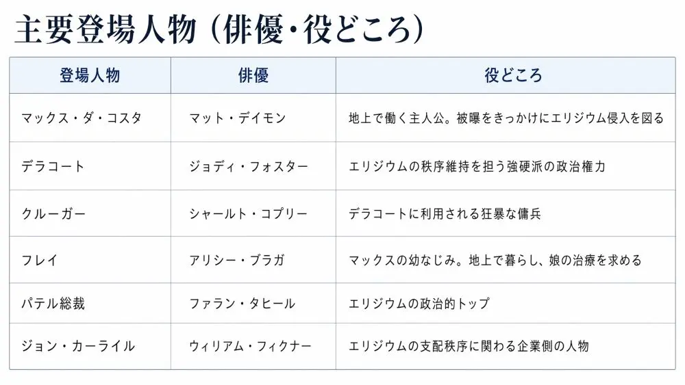 そのためマックスは、反政府系の犯罪組織の力を借りてエリジウム侵入を試みる。しかしその行動は、やがてエリジウムの支配秩序そのものを揺るがす情報へとつながっていく。彼の前に立ちはだかるのは、秩序維持を最優先するデラコートと、その手足として私的暴力を行使する傭兵クルーガーである。